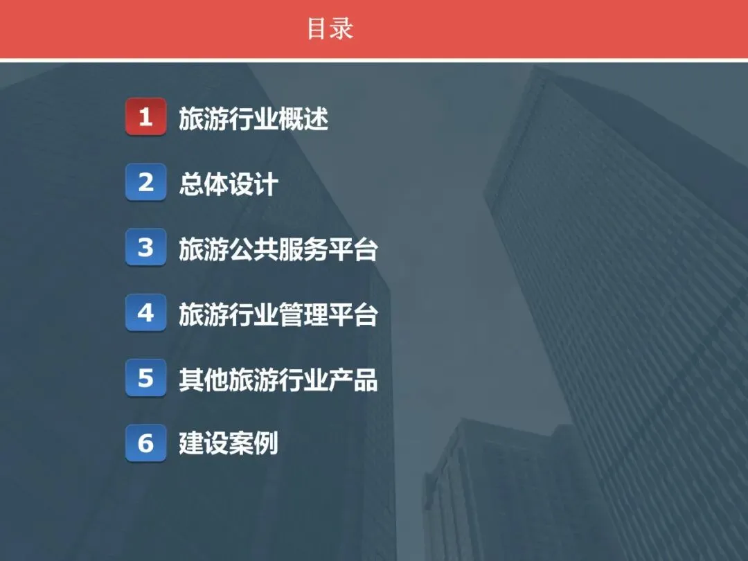 01、旅游行业概述 02、总体设计 03、旅游公共服务平台 04、旅游行业管理平台 05、其他旅游行业产品 06、建设案例 |