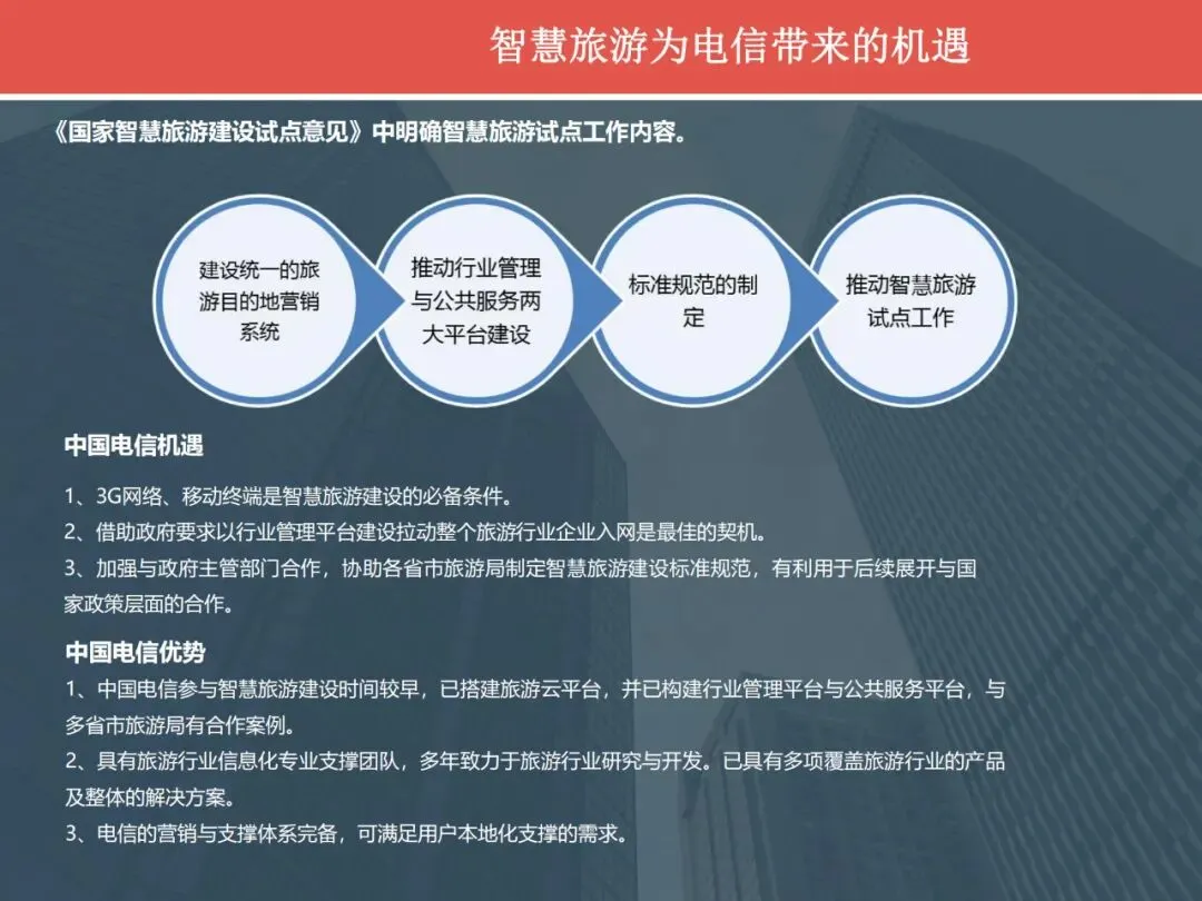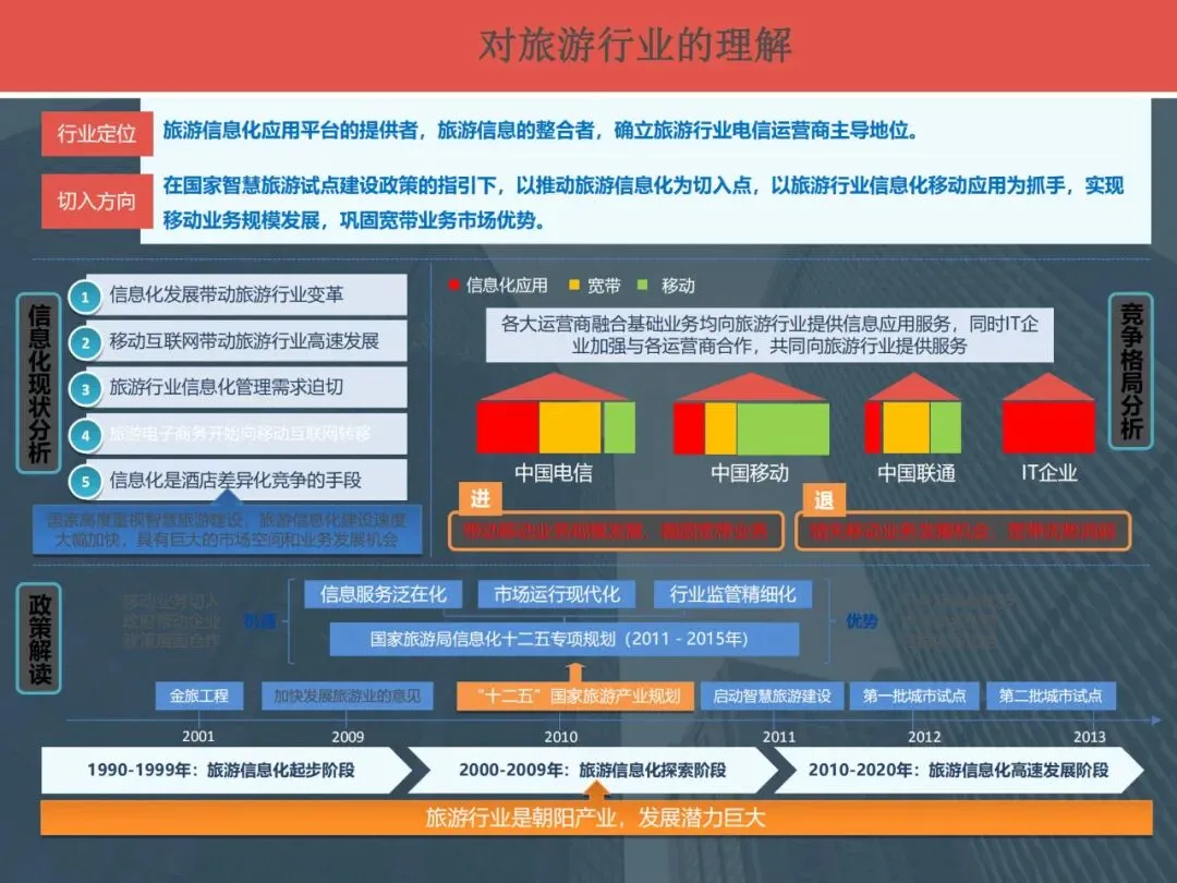 切入方向:在国家智慧旅游试点建设政策的指引下,以推动旅游信息化为切入点,以旅游行业信息化移动应用为抓手,实现移动业务规模发展,巩固带宽业务市场优势。