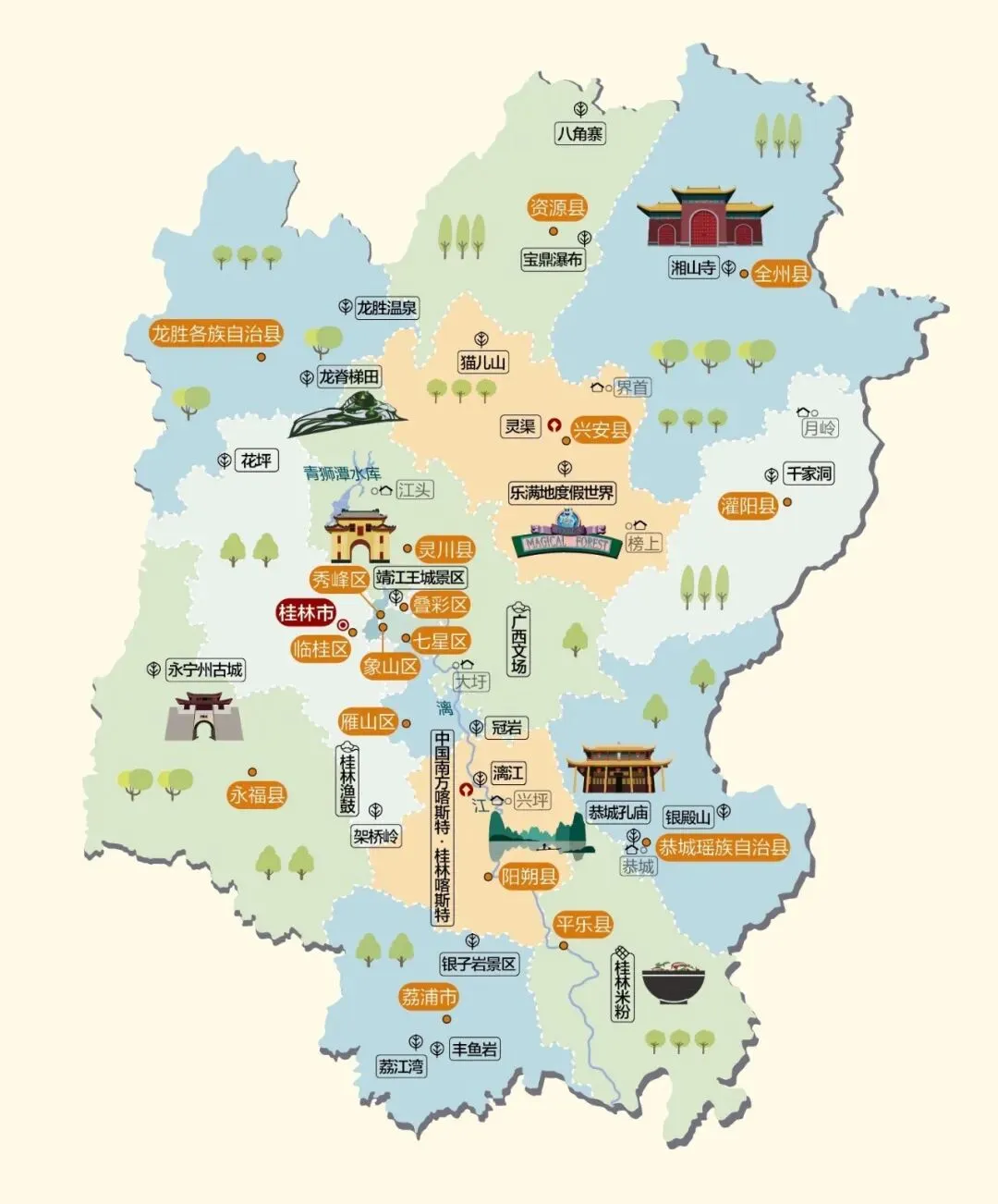 今天我对照了广西 14 个地级市的文旅地图,梳理了各地代表性的景点,并且还推荐了当地的非遗文化、人文地标,地道美食。收藏好这一篇,不用再东拼西找,跟着地图就能玩遍八桂大地!本次分享桂林。