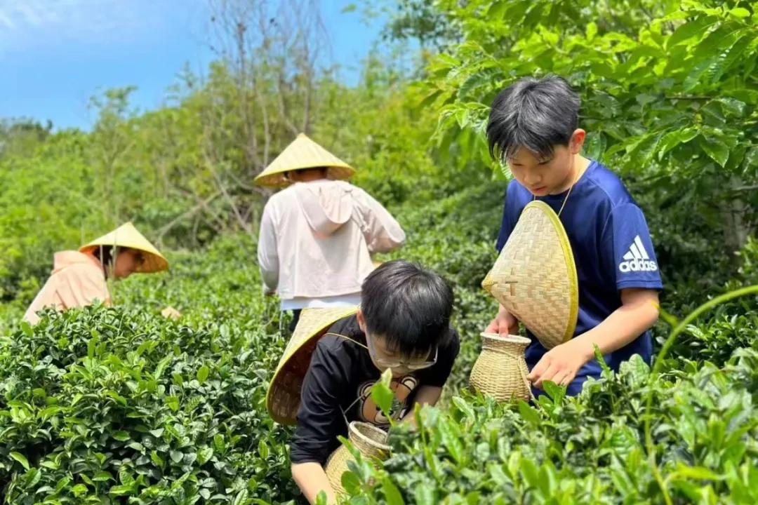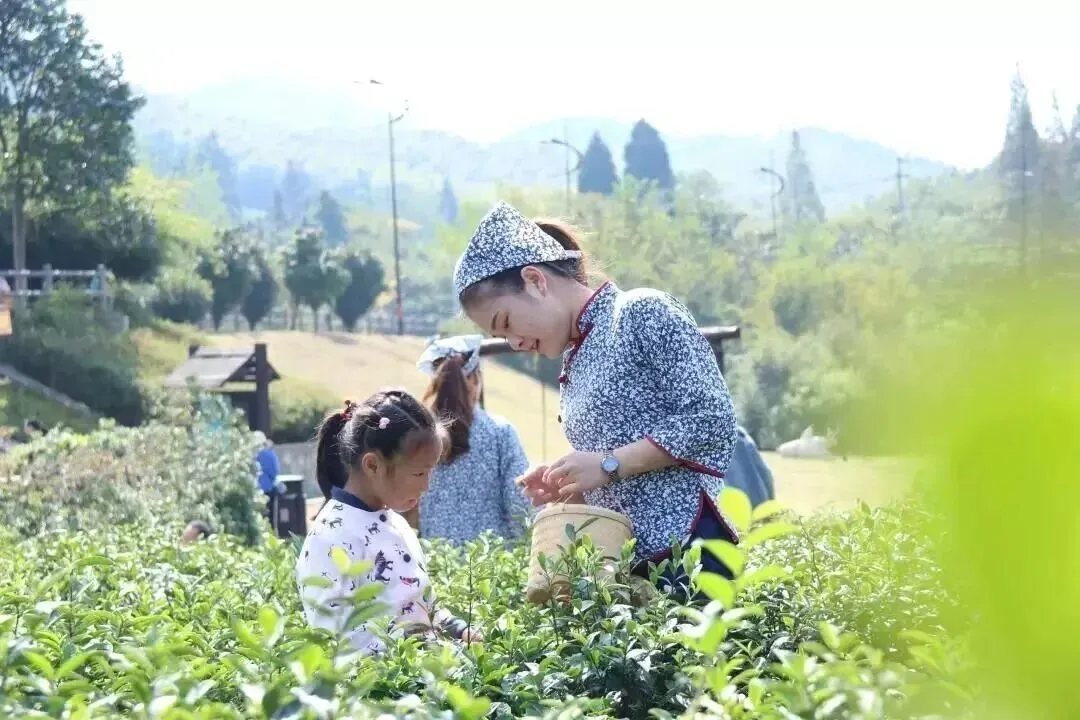 走进万亩茶园,茶农现场教学,孩子挎上茶篓,轻捻茶香沉浸式感受茶田之趣。