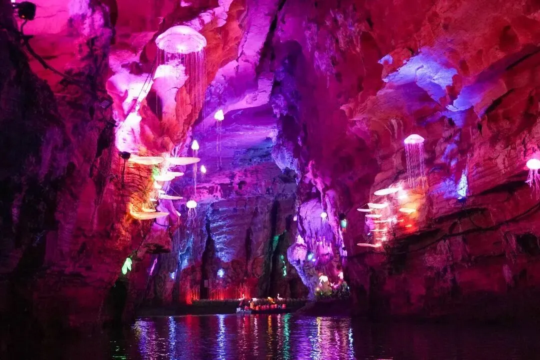 水莲洞是景区的核心地标,为典型喀斯特岩溶地貌溶洞。经勘探,溶洞总长度达2万米,目前已开发游览长度5000米,其中包含3000米可全程乘船通行的地下伏河段,是国内为数不多的长距离、常态化通航地下暗河。