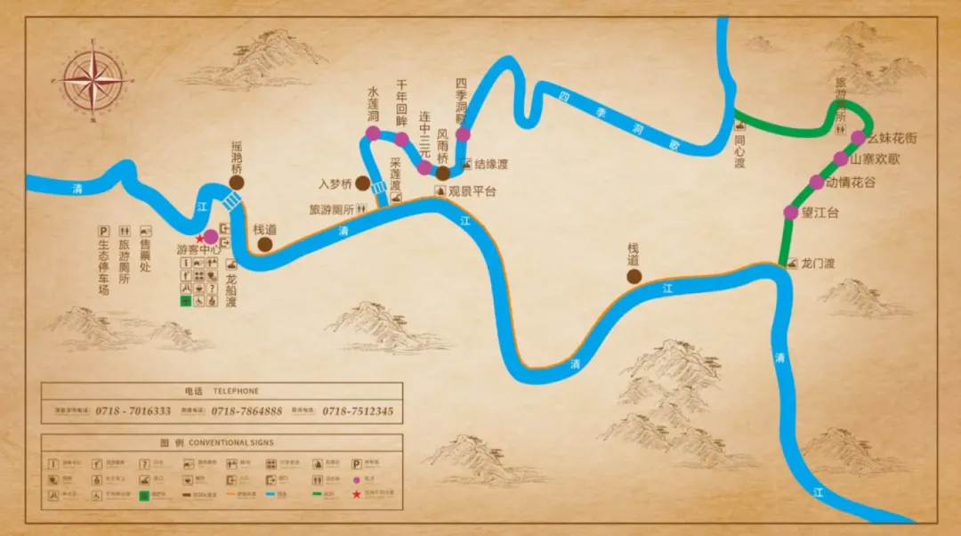 清江风光线:游客服务中心 - 摇滟桥 - 湿地乐园 - 入梦桥 - 水莲洞 - 风雨桥 - 河边栈道 - 龙门渡 - 龙船渡 - 游客服务中心,全程9公里,游览时长3小时,兼顾溶洞游览与清江画廊山水观光;