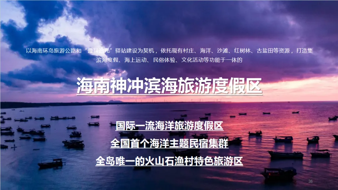 项目以海南环岛旅游公路和“儋耳追光”驿站建设为契机,依托现有村庄、海洋、沙滩、红树林、古盐田等资源,打造集滨海度假、海上运动、民俗体验、文化活动等功能于一体的海南神冲滨海旅游度假区、国际一流海洋旅游度假区、全国首个海洋主题民宿集群、全岛唯一的火山石渔村特色旅游区。