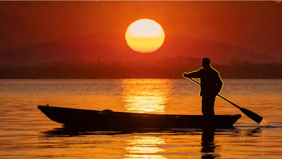 :一元纸币同款。蹲拍三塔“品”字形,远山若隐。最佳:清晨6:30-8:00或傍晚16:30-17:30。 - ② 手划船逆光