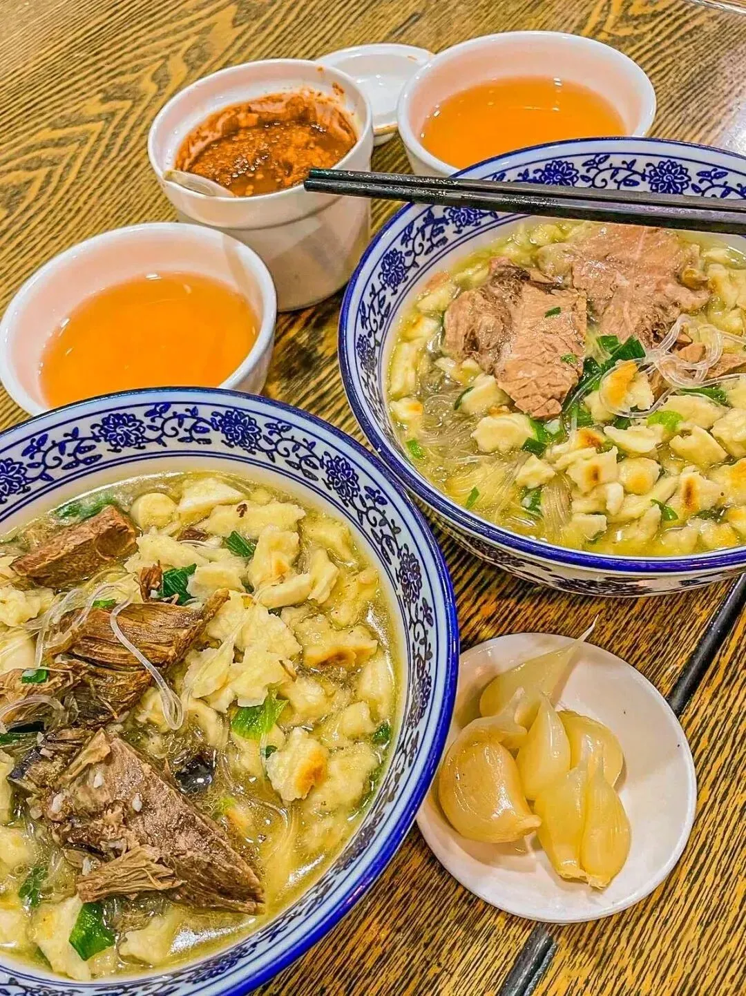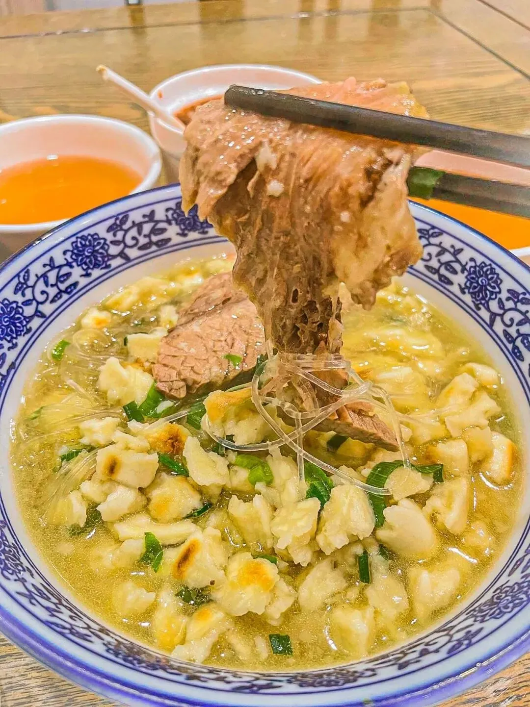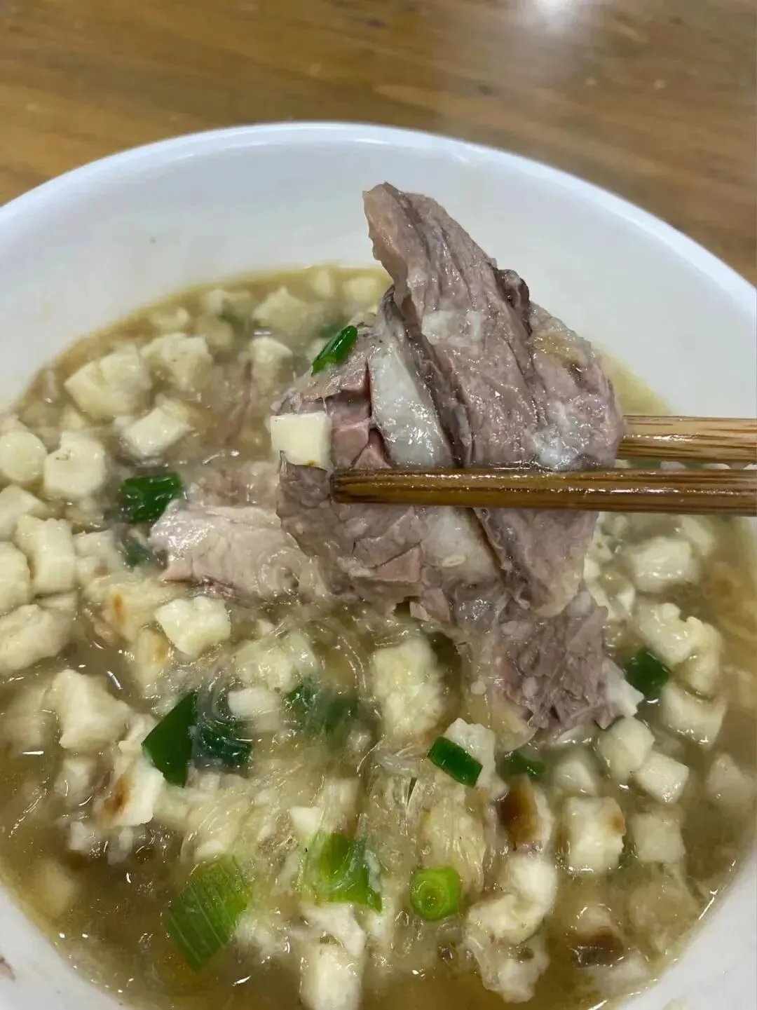 通常得把馍掰成黄豆粒大小,煮进一碗羊肉汤中,馍馍粒吸饱了汤汁,羊肉片若隐若现地躲在汤里,羊汤浓郁醇鲜,羊肉肥而不腻,馍馍很韧很有嚼劲,吃一次就上瘾。