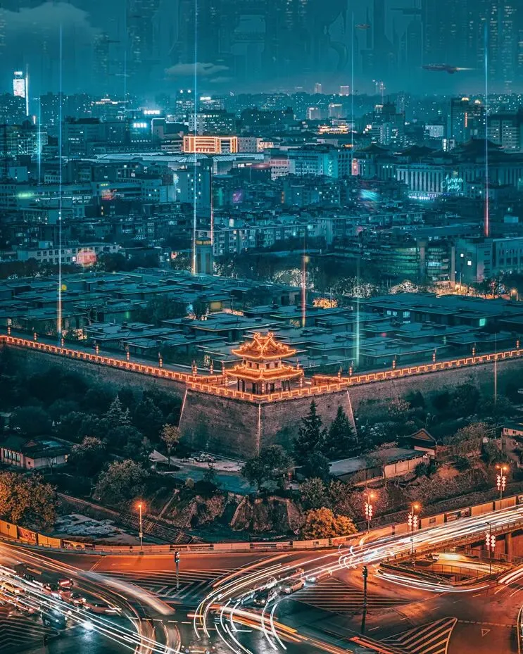 晚上灯火通明,杨贵妃穿着数字汉服跳起霓裳舞,电子琵琶的琴划伤歌姬手掌,西安有一股赛博朋克的美。