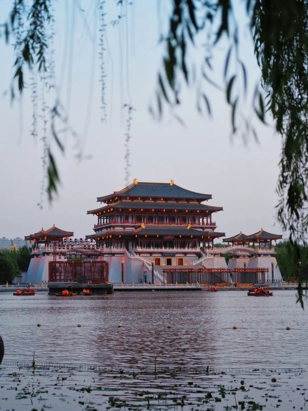 这里的建筑是完全仿照唐代皇家园林样式建造,占地有1000亩。恢宏的建筑旁是荷塘、翠湖和绿植环绕的长廊,古韵超浓。