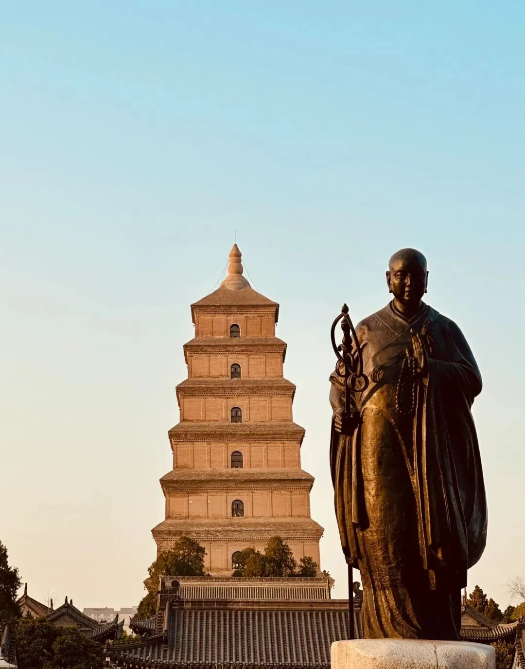 这里供奉着玄奘从印度带回的佛像、舍利、梵文经书,阳光洒在大雁塔上,美极了,还能远眺南边的钟南山。