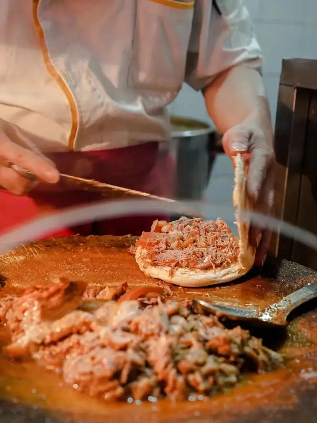 与外头常吃的青椒肉夹馍不同,纯正的肉夹馍往往只有厚实的肉,不加一丁点青椒,蔬菜,肉真的可香可香。