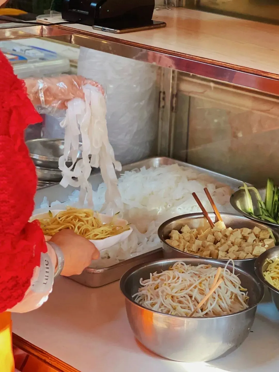 凉皮的配菜就是黄瓜丝、豆芽、香菜,用蒜水、醋、酱油、盐等调味,最后那一勺辣子简直就是凉皮的灵魂。