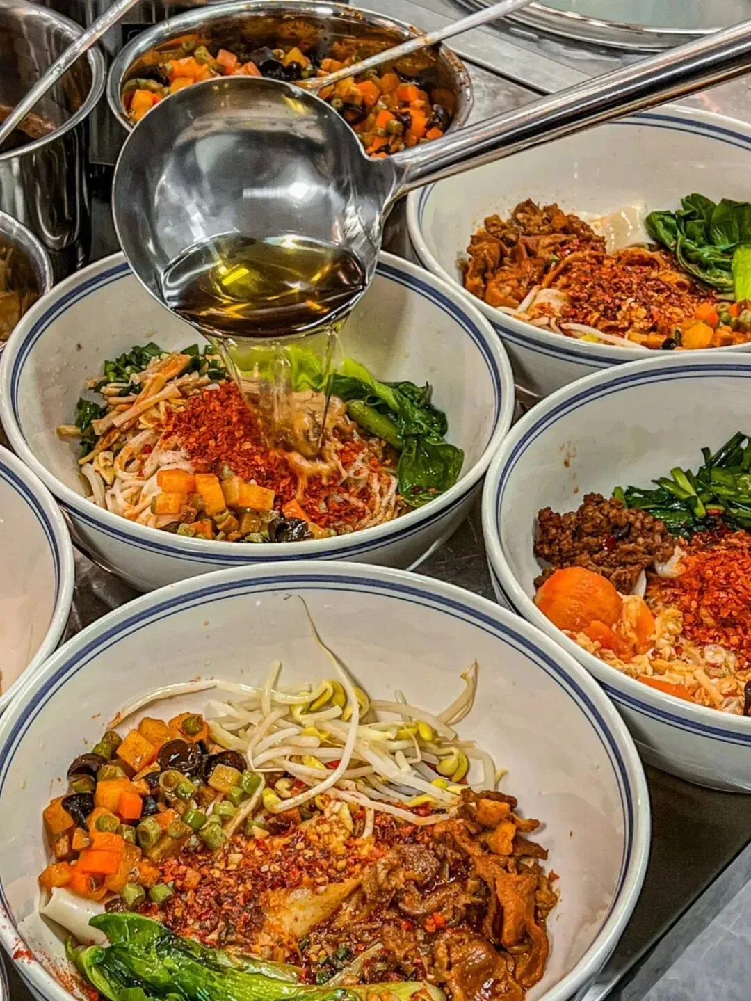 当那一勺滚烫的油汁浇入了面碗里,爆发出“滋啦啦”的响声,辣椒和蒜泥的香气便四散开来,用筷子搅拌几下,每根面条都会被油光蹭亮的辣子所包裹。