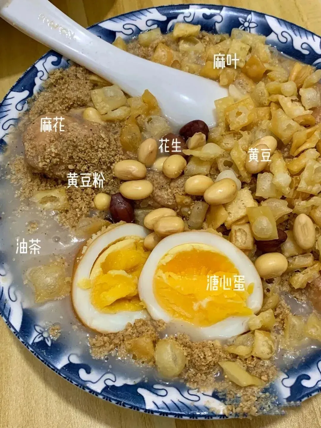 热乎乎的油茶泡着酥脆脆的麻花,还有炒好的油茶豆子粉,花生,杏仁,黄豆等,记得不要搅拌,油香,面香,花生香,混合着杏仁香,口感层层叠加!