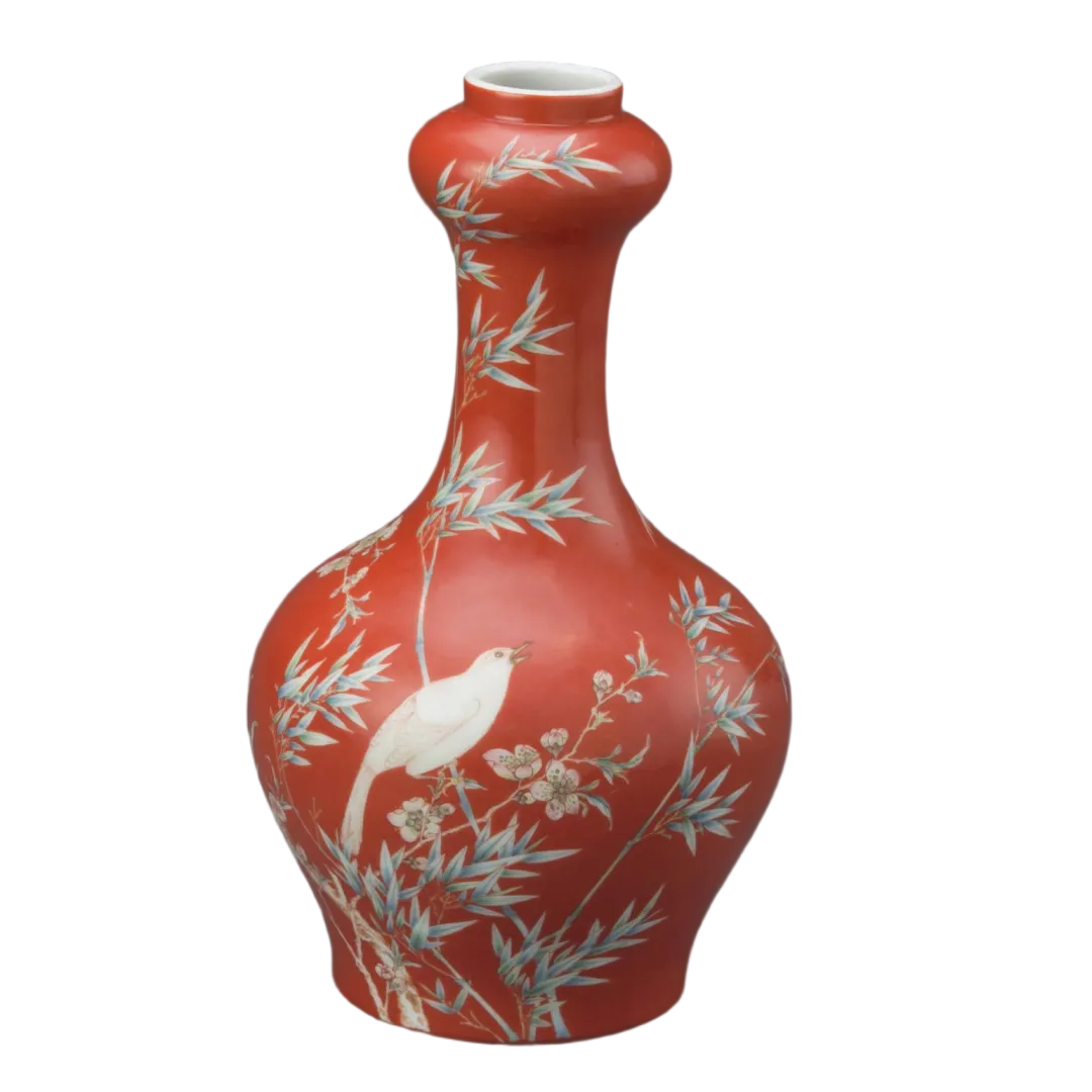 珊瑚红地珐琅彩花鸟纹瓶