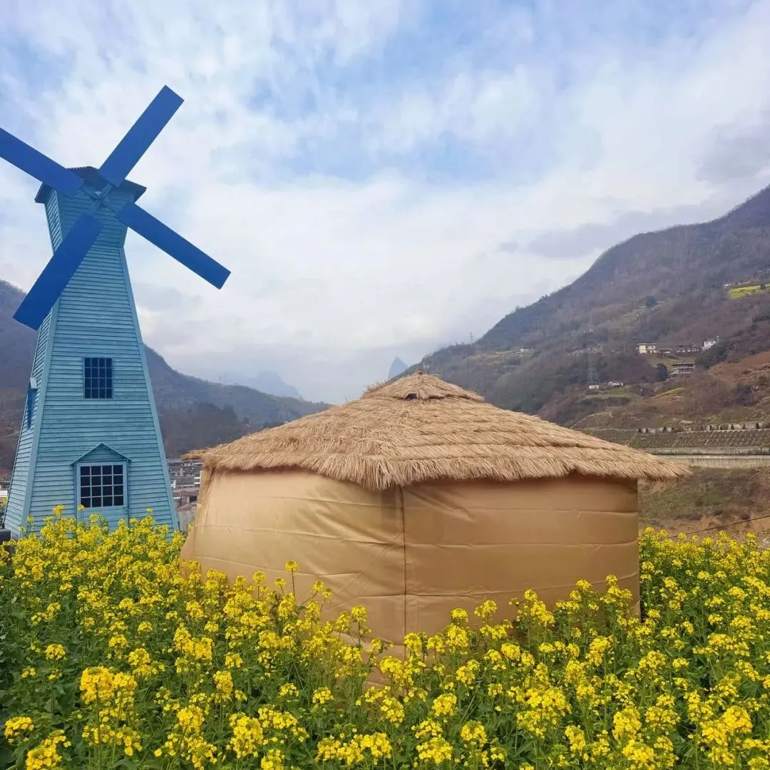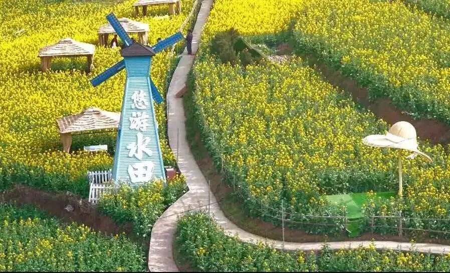 水田村油菜花基地,每到春天,千亩花海竞相绽放,金色浪涛绵延不绝。彩虹步道穿梭其间,天蓝风车缓缓转动,纸鸢随风起舞,一步一景、一步一画。