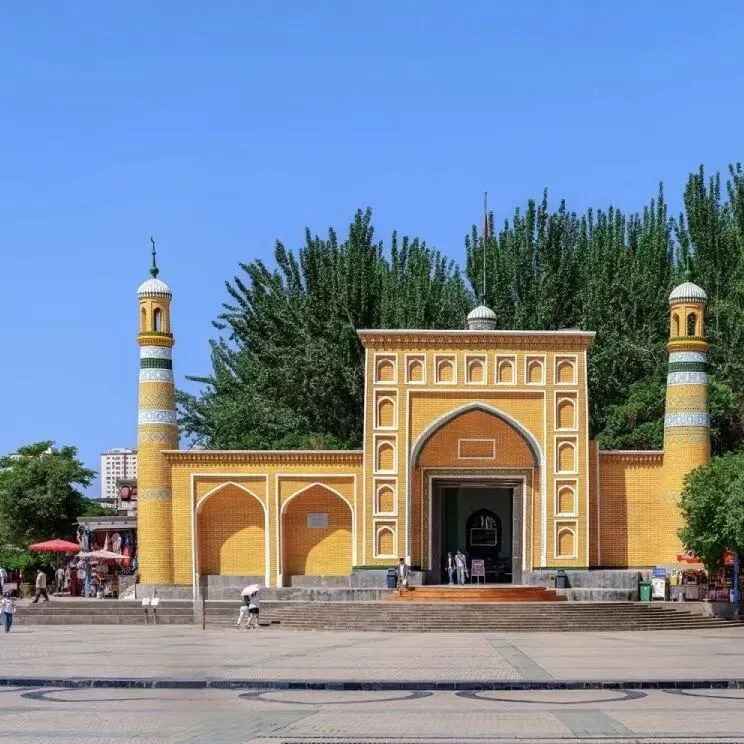 艾提尕尔大清真,黄砖宣礼,主麻节庆万众聚礼传千年,新疆最大的清真寺,阿拉伯式建筑,兼有维吾尔族古代建筑风格。