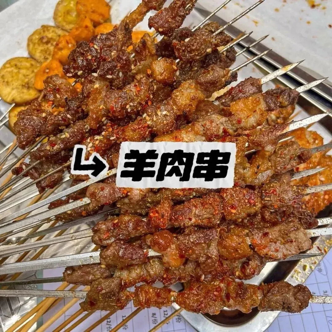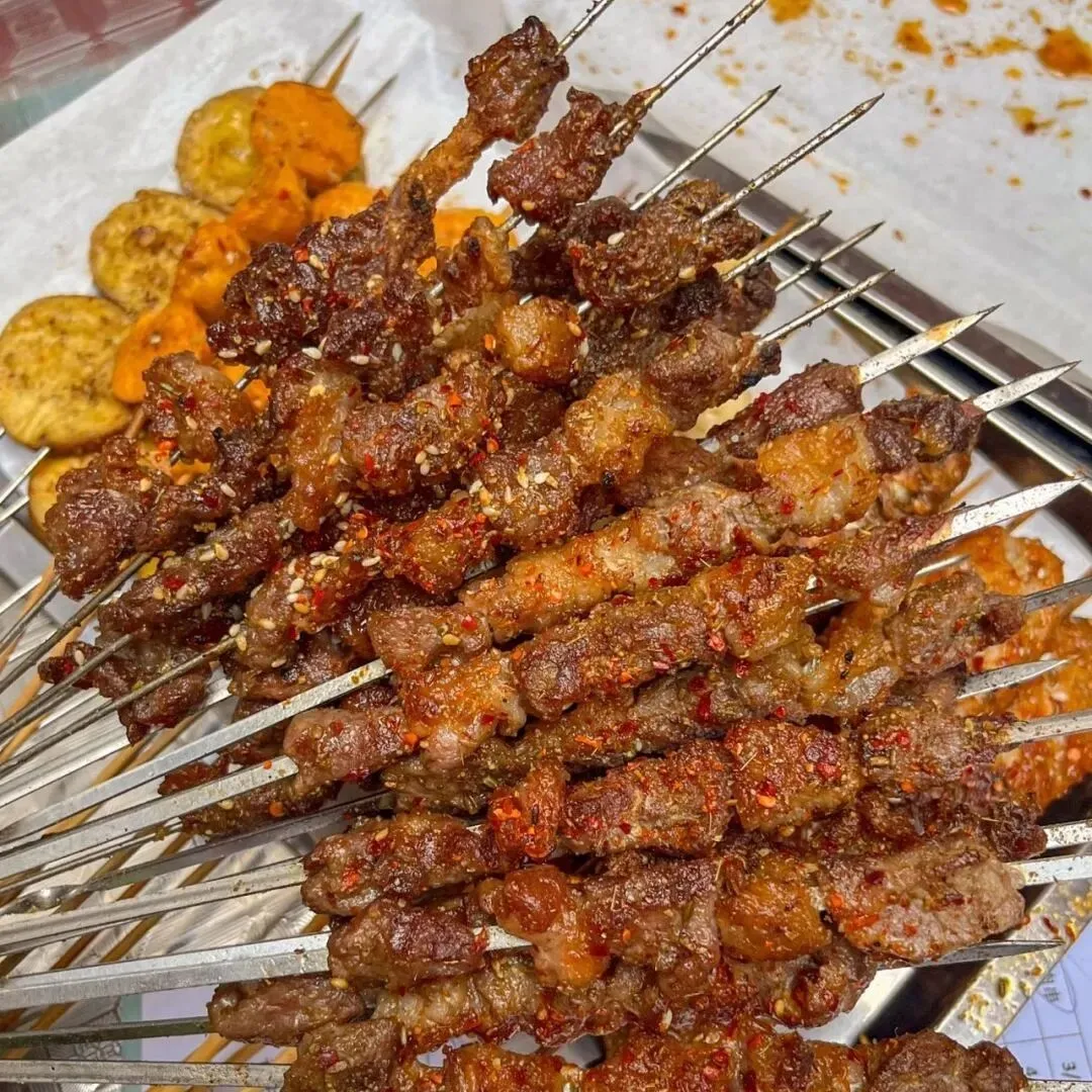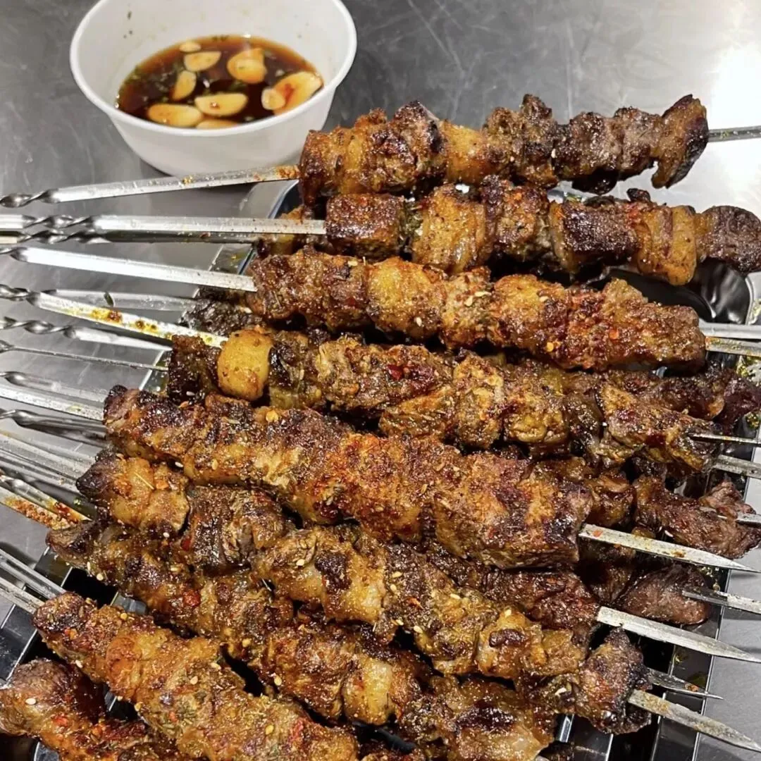 新疆羊肉串地道十足,大块羊肉以红柳枝串起,炭火烤制滋滋出油,外焦里嫩,撒上孜然与辣椒,香气四溢,风味醇厚。