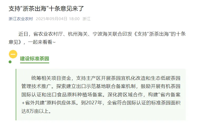 近年来,中国茶文旅的国际影响力持续提升,越来越多的海外游客走进中国茶园,感受中国茶文化的魅力;同时,中国茶文旅也在主动“走出去”,推动茶文化与国际文旅市场深度对接。如浙江省农业农村厅联合杭州海关、宁波海关共同发布的《支持“浙茶出海”的十条意见》中的“推动文化传播”部分,提出创新农业外事活动载体,推广“茶园+创意加工”“茶园+主题民宿”“茶园+风景名胜”等特色体验模式,提升浙茶文化国际传播效能等意见,为茶产业与旅游、文化的深度融合打开了想象空间。
