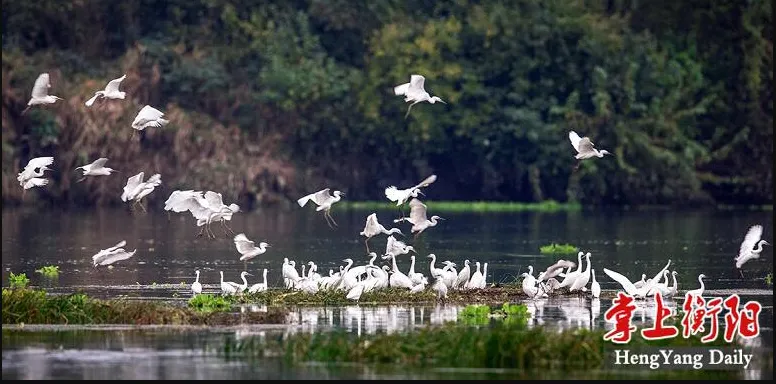 ▲江口鸟洲,群鹭翩翩起舞。陈俊摄