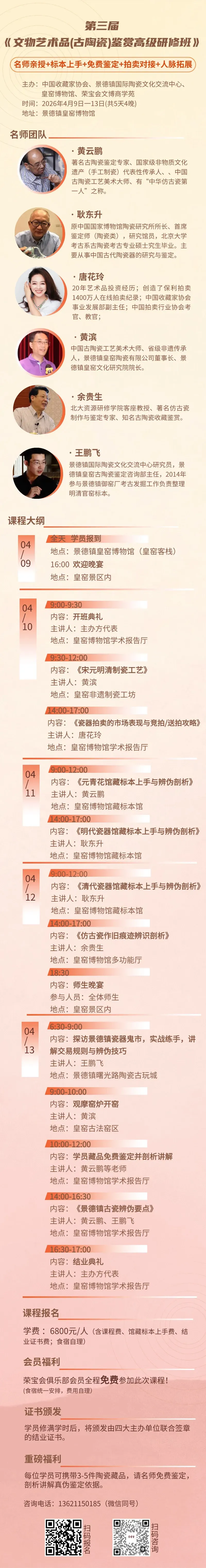 2026 年 4 月 9 日 - 13 日,由中国收藏家协会、景德镇国际陶瓷文化交流中心、皇窑博物馆、荣宝会文博商学苑联合主办的第三届《文物艺术品(古陶瓷)鉴赏高级研修班》,将在景德镇皇窑博物馆开启 5 天 4 晚的深度研学。