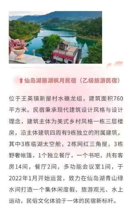 ❤️住宿:推荐仙岛湖山居秋暝民宿、月上云间假日营地、网湖边民宿等,设施完善,风格多样,可满足亲子度假需求。