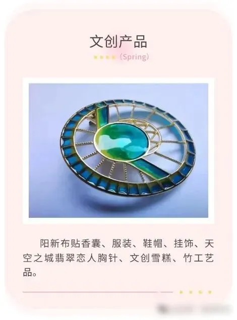 - “天空之城”是阳新著名景区(位于仙岛湖),以悬空玻璃栈道和高空观景台闻名,该胸针可能以此为设计灵感。