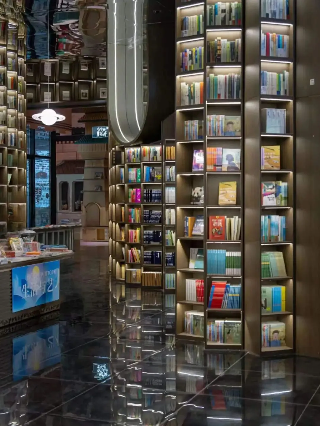 - 空间设计:以镜面、光影和阶梯式书架打造出「无限延伸」的视觉效果,营造出「动态与静态、古典与现代」的对话氛围,仿佛走进书的魔法世界。