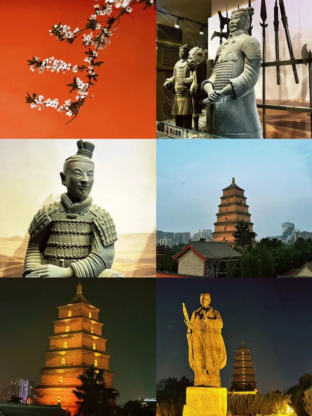 大雁塔:建于唐长安城晋昌坊(今陕西省西安市南)的大慈恩寺内,又名“慈恩寺塔”,今存。塔高64米,塔身枋、斗拱、栏额均为青砖仿木结构。玄奘法师为供奉从印度带回的佛像、舍利和梵文经典而建造的一座五层砖塔。 兵马俑:是第一批全国重点文物保护单位、第一批中国世界遗产,位于今陕西省西安市临潼区秦始皇陵以东1.5千米处的兵马俑坑内。先后有200多位外国元首和政府首脑参观访问,成为中国古代辉煌文明的一张金字名片,又被誉为世界十大古墓稀世珍宝之一。