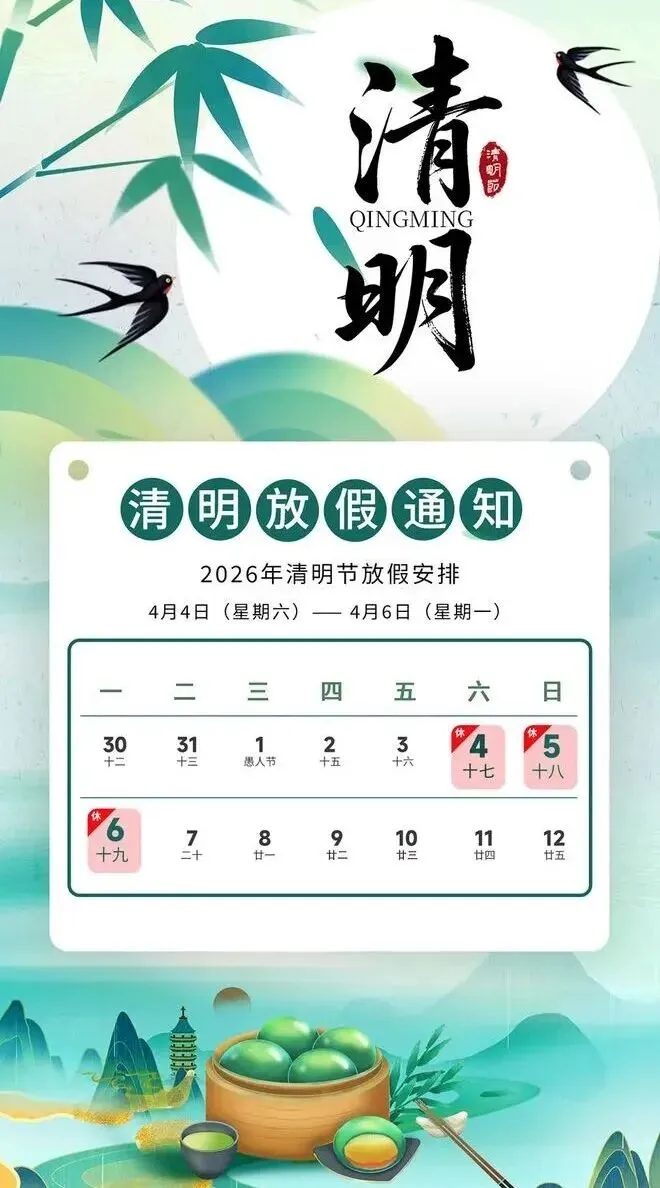 2026年清明节假期时间为:4月4日(周六)至6日(周一),共3天。