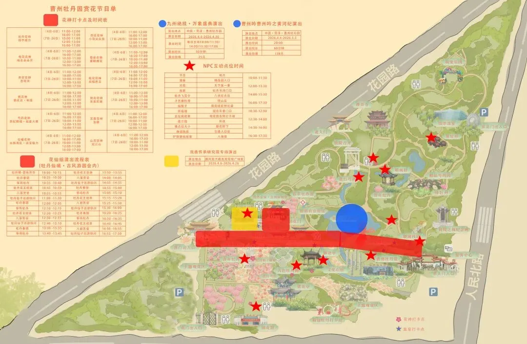 2、牡丹花期受天气影响较大,气温、降水等因素可能导致开花时间略有变动。园区将联合气象部门密切监测花情与天气,实时调整花期信息,请持续关注“文旅菏泽”“曹州牡丹园景区”官方公众号,出行前务必查看最新通知。活动内容或因运营等因素调整,请以园区实际为准。