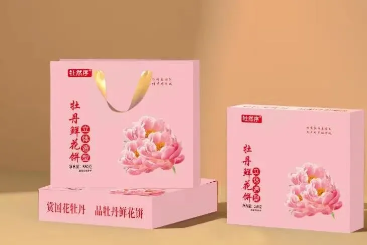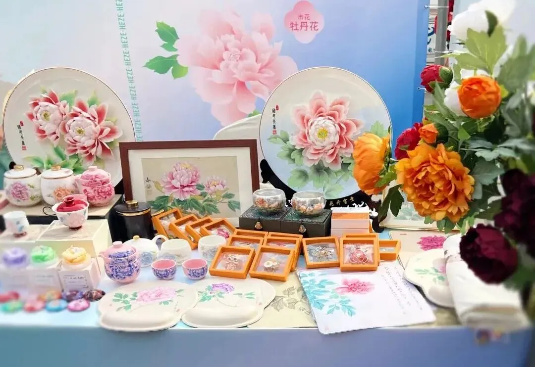 园区东西主干道区域:DIY文创包、牡丹纯露低氘水、牡丹清露苏打水、鲜花饼、牡丹瓷器等特色衍生产品,一口解锁牡丹风味。