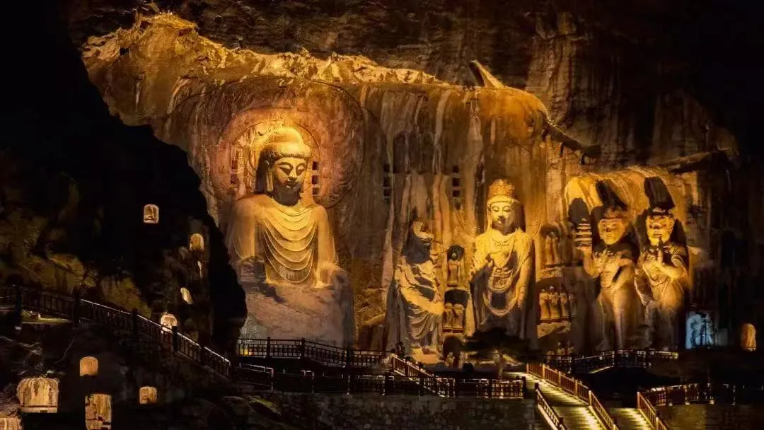 当华灯初上,龙门石窟在灯辉下的景色更加别致,万龛石壁在伊河畔熠熠生辉,龙门石窟跨越千年的华美清幽雅致、玄妙而空灵。