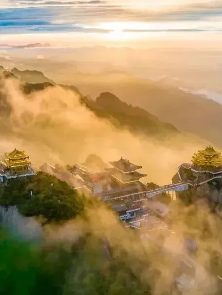 作为老君山的文化地标,三座金殿随天气变幻呈现不同奇观:晴天的金殿璀璨如天宫现世,日出时分霞光与飞檐共舞,云海翻涌时更如奇妙仙境。