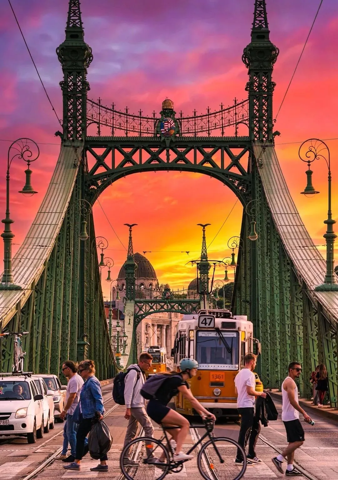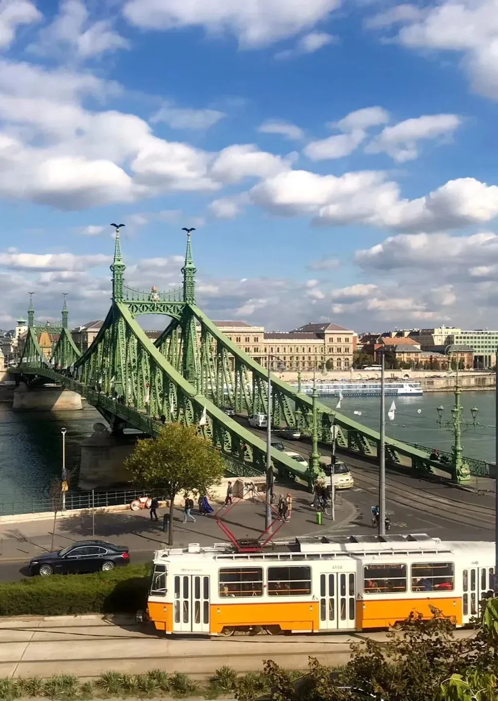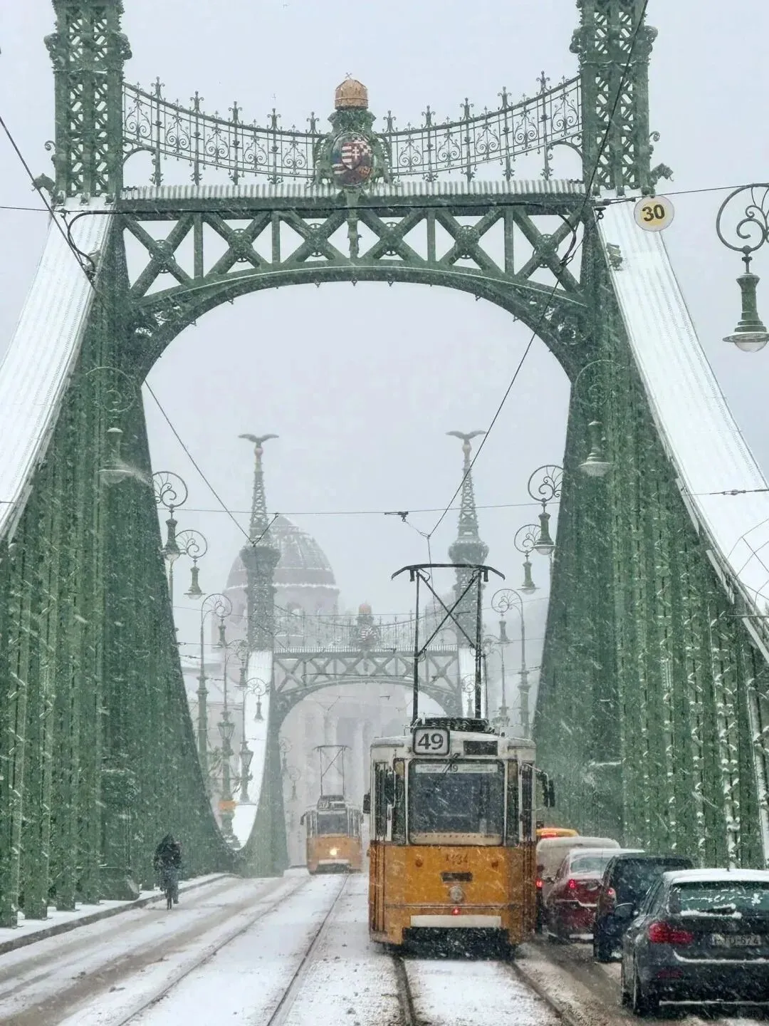 “多瑙河上的绿丝带”,绿色的桥身、黄色的电车、桥头的图鲁尔鸟,构成了布达佩斯最具工业浪漫味的画面。