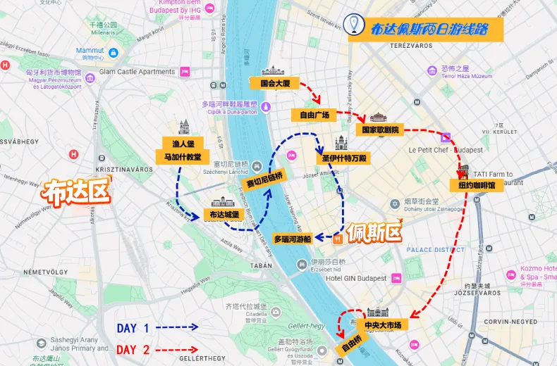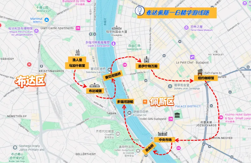 渔人堡&马加什教堂→布达城堡→塞切尼链桥→圣伊什特万圣殿→纽约咖啡馆→中央市场→自由桥→多瑙河游船