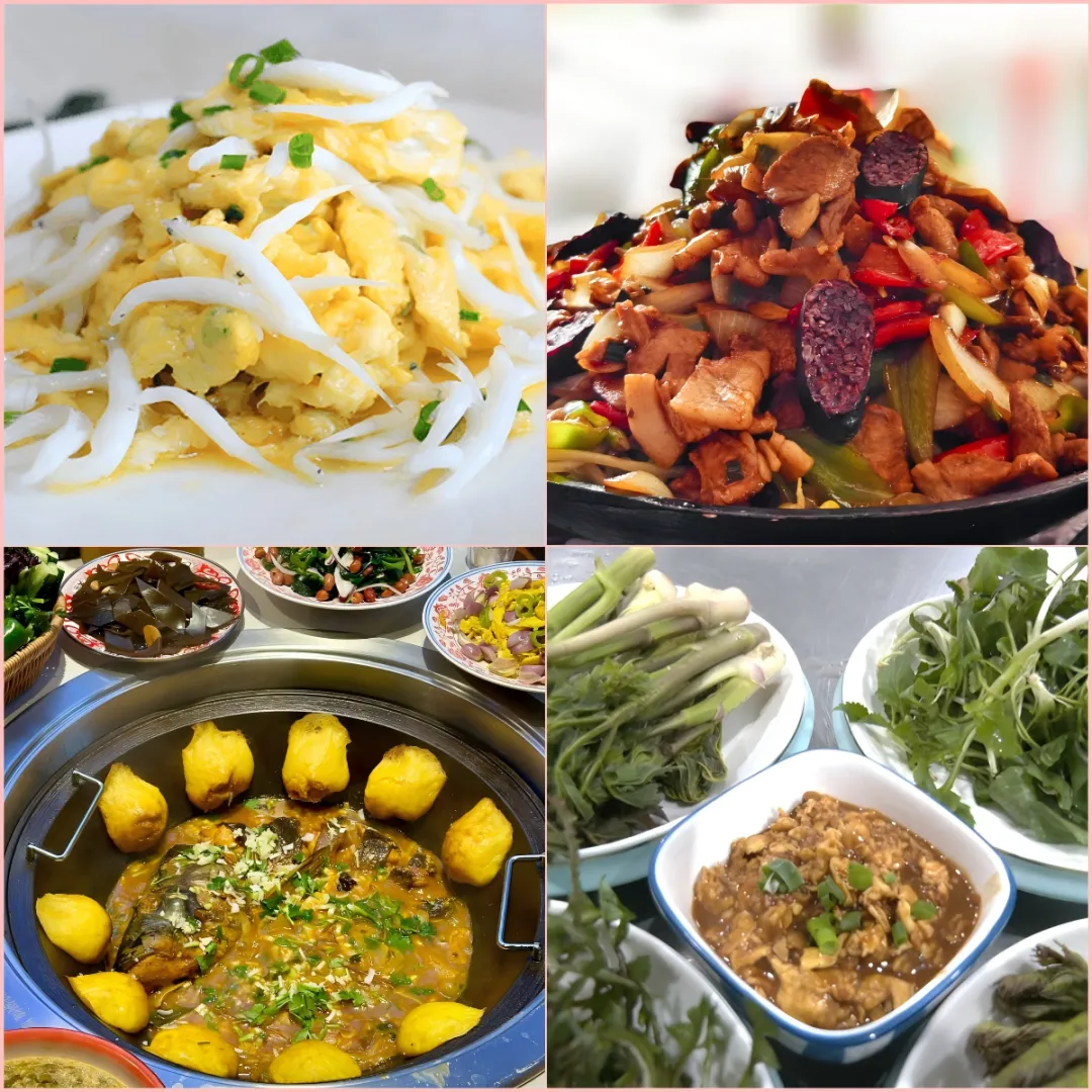 - 刺嫩芽炒笨鸡蛋:春季山珍,鲜嫩清爽