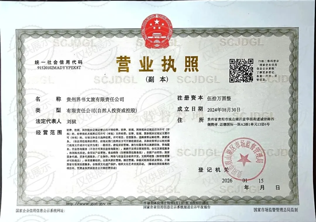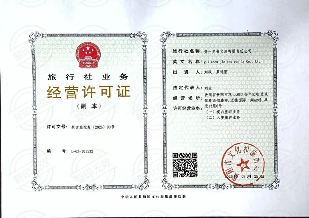 图片:界书文旅执行的大型团队旅行活动。 必须有《旅行社业务经营许可证》和《营业执照》:只有两证齐全的正规旅行社,才有资质开展旅游包车业务,个人、普通租车公司无旅游营运资质。 以下为界书文旅公司合法资质: