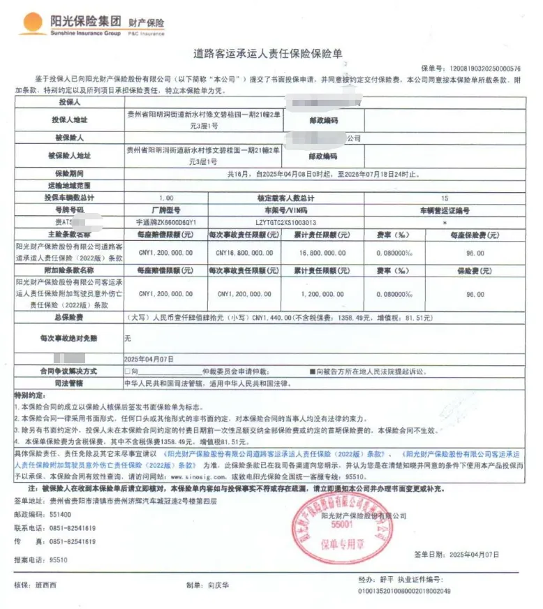 此外,正规包车必须买交强险、100 万以上商业三者险、每个座位不低于 50 万的道路客运承运人责任险,全方位保障出行安全。 以下为界书文旅选用车辆购买的保险单: