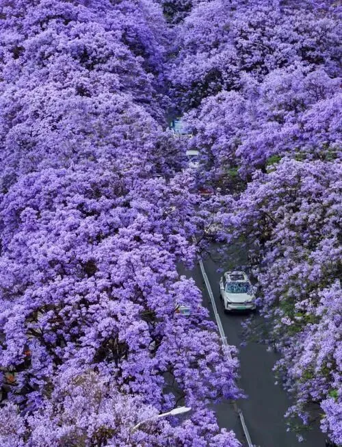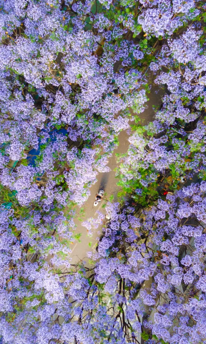 昆明蓝花楹 “顶流”,2 公里紫色花隧。莲华菜市场天桥是俯瞰全景的最佳机位。