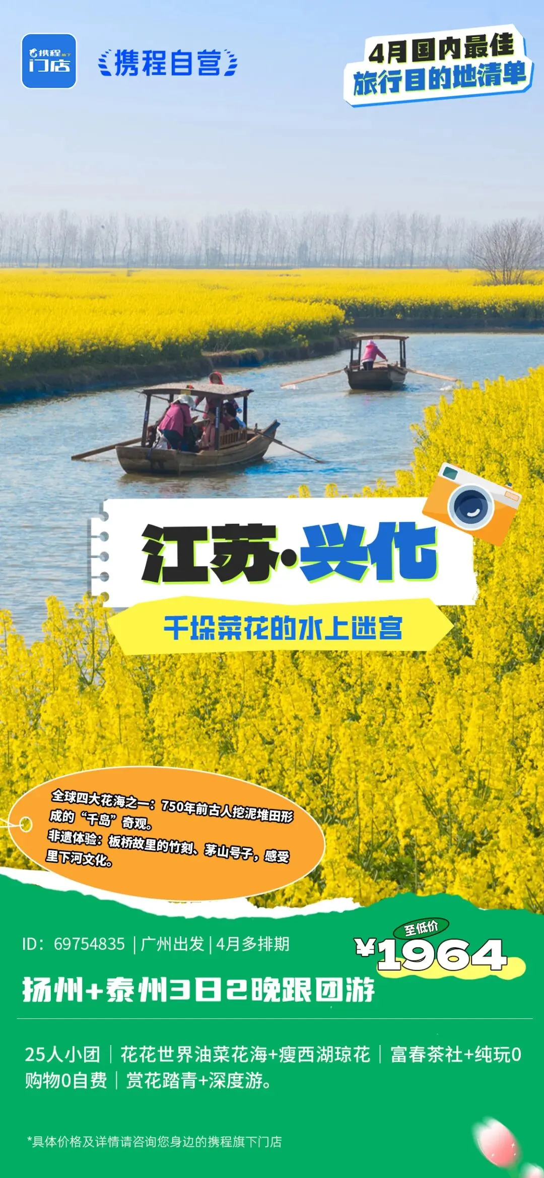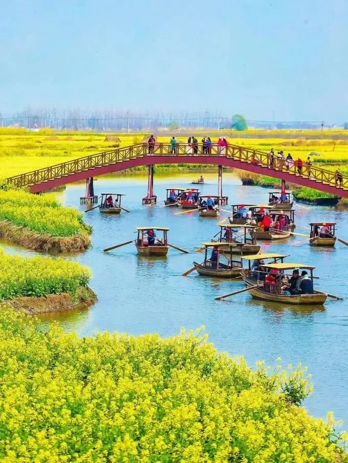 泰州兴化千垛景区是国家 AAAA 级景区、全球重要农业文化遗产,拥有 750 年历史的垛田地貌。清明前后(3 月底 —4 月中旬),四面环水的万千土垛开满金黄油菜花,呈现 “河有万湾多碧水,田无一垛不黄花” 的奇景。可登观景塔俯瞰金色群岛,乘摇橹船穿行花间水道,沉浸式感受水乡春韵,2009 年获评 “中国最美油菜花海”。