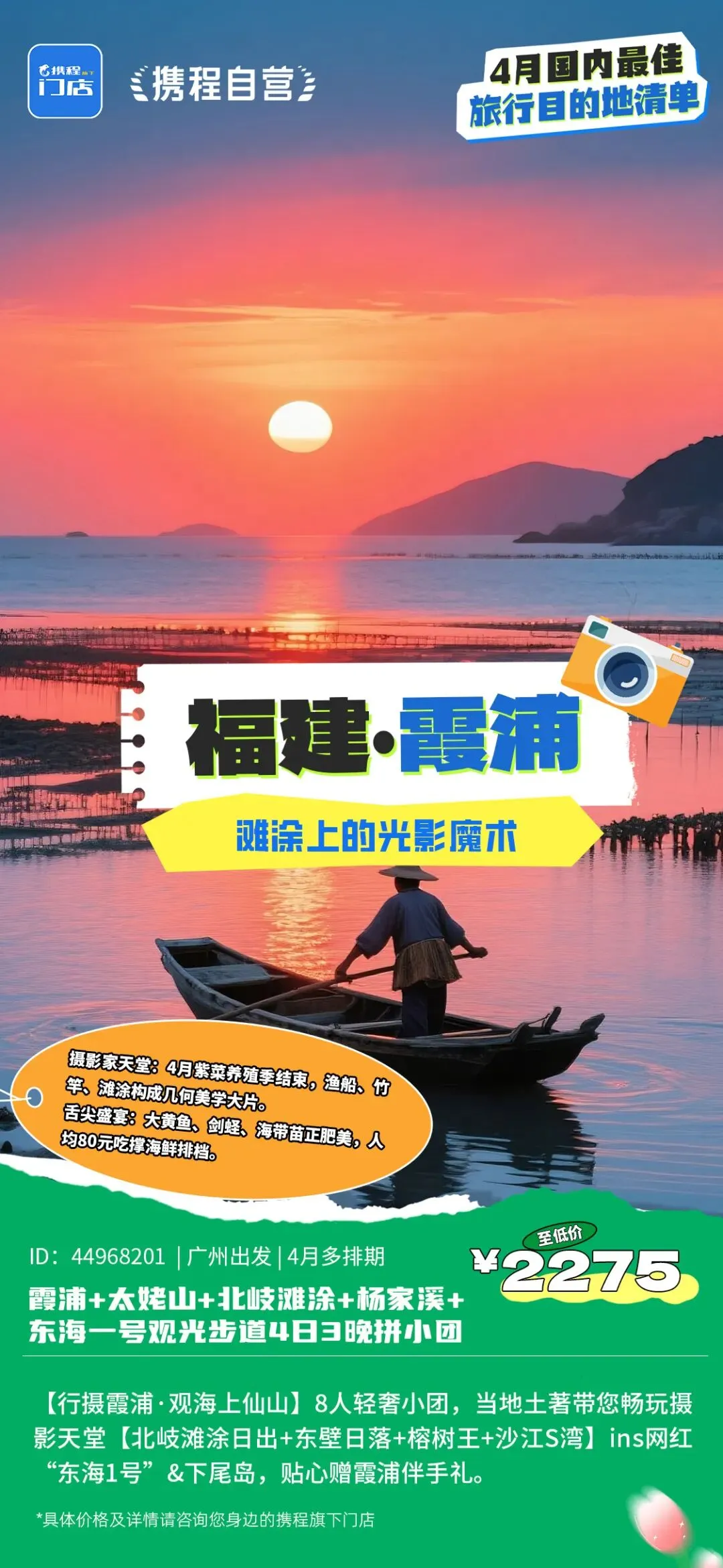 4 月的霞浦,是海带丰收与滩涂光影交织的黄金季,被称作 “中国最美滩涂”。花竹村看云海日出,福瑶列岛与渔船剪影入画;沙江 S 湾竹竿织就海上 S 线,东壁村日落染红海面与光影栈道;杨家溪古榕新绿,晨雾光影如诗。还能尝鲜活海鲜、逛半月里畲族古村。东海一号公路自驾串联美景,务必提前查潮汐表,日出日落出片最佳。