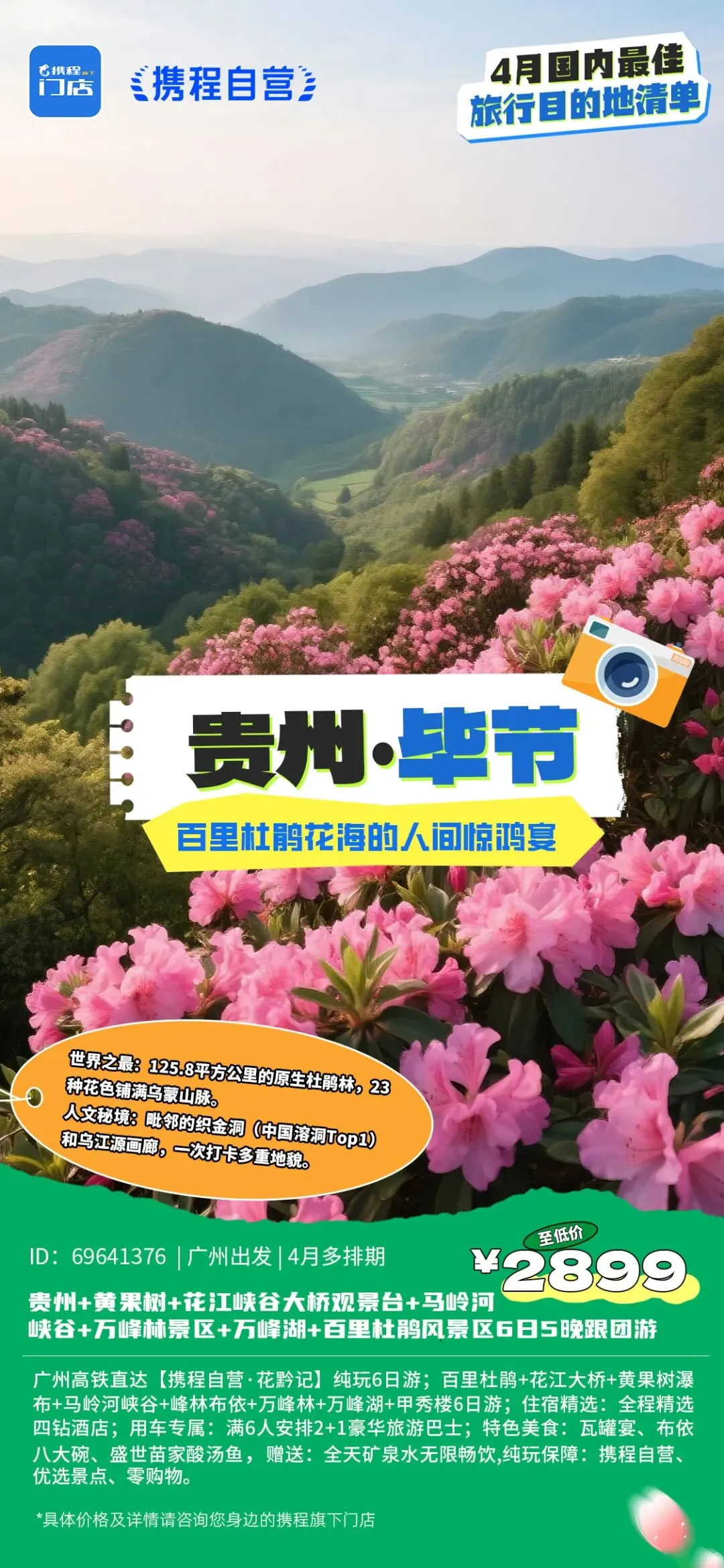 4 月的毕节,迎来百里杜鹃全年最美盛花期携程。作为国家 5A 级景区、全球最大原生杜鹃林带,125.8 平方公里花海绵延起伏。马缨、露珠等 60 余种杜鹃竞相怒放,红似火、粉如霞、白胜雪,一树可开七色,被誉为 “地球彩带、世界花园”。金坡景区索玛花桥、普底景区数花峰为最佳打卡点。晨雾漫山、夕阳染峰,漫步木栈道穿行花浪,还可体验彝族祭花神等民俗。4 月初至中旬为黄金观赏期,视觉震撼,出片率极高。