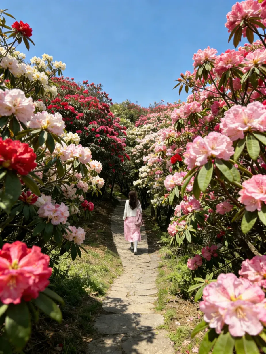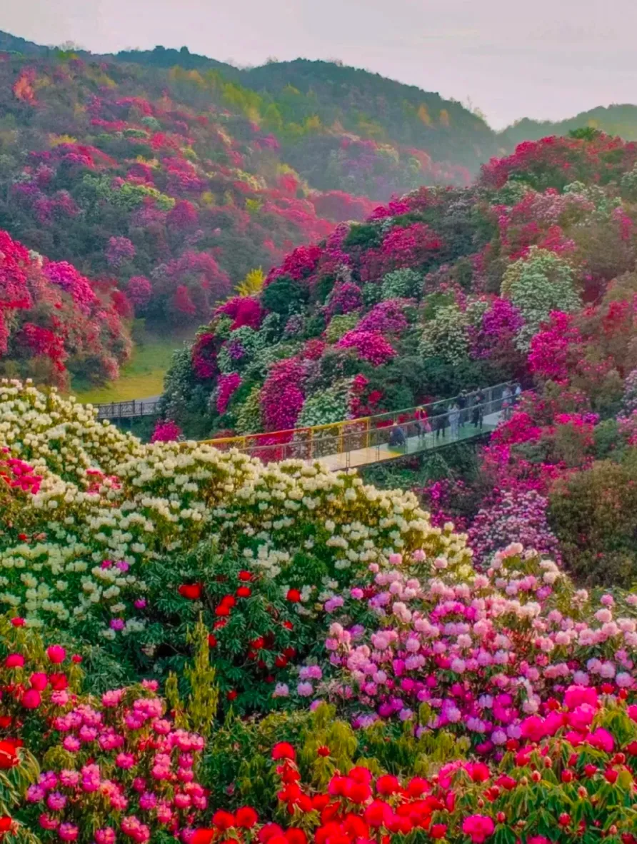 五条步道被红、粉、白、紫各色杜鹃环绕,是 “地球彩带” 的最佳观景点。