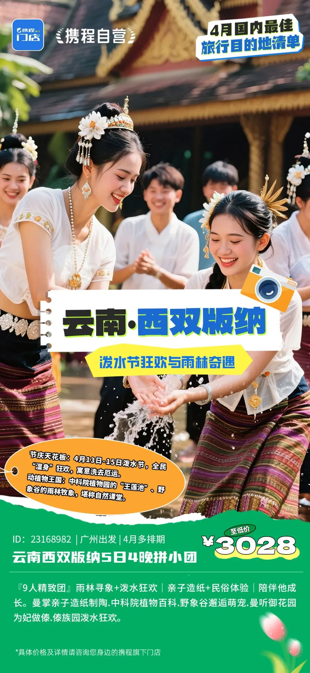 漫步云南昆明,满城蓝花楹悄然盛放,街道、公园尽覆紫雾花海,微风落英浪漫至极;移步西双版纳,火热泼水节激情开场,傣家风情浓郁,水花飞舞间尽是春日狂欢与民族活力。