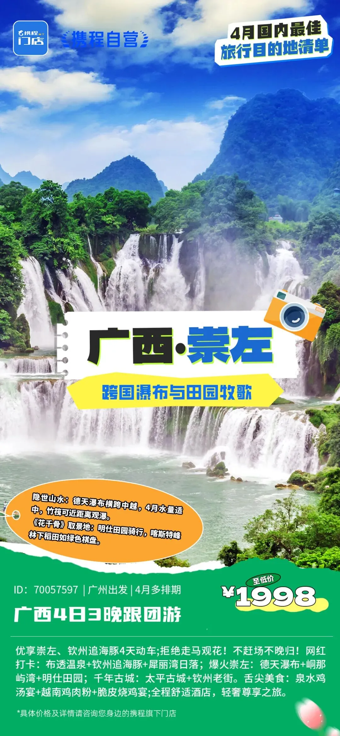 4 月的崇左,气温 15-26℃,温润宜人,正值错峰出游黄金期。德天跨国瀑布进入丰水期,气势磅礴,水雾缭绕常现彩虹。明仕田园晨雾缥缈,峰林倒映,乘竹筏如游水墨画卷。世界遗产花山岩画古朴神秘,诉说壮族千年史诗。太平古城夜色璀璨,灯笼映水,尽显壮乡风情。卜花村油菜花、木棉花竞相绽放,花海映碧水。尝越南鸡粉、壮家簸箕宴,品中越风味。4 月人少景静、性价比高,是探秘边境山水与人文的绝佳时节。