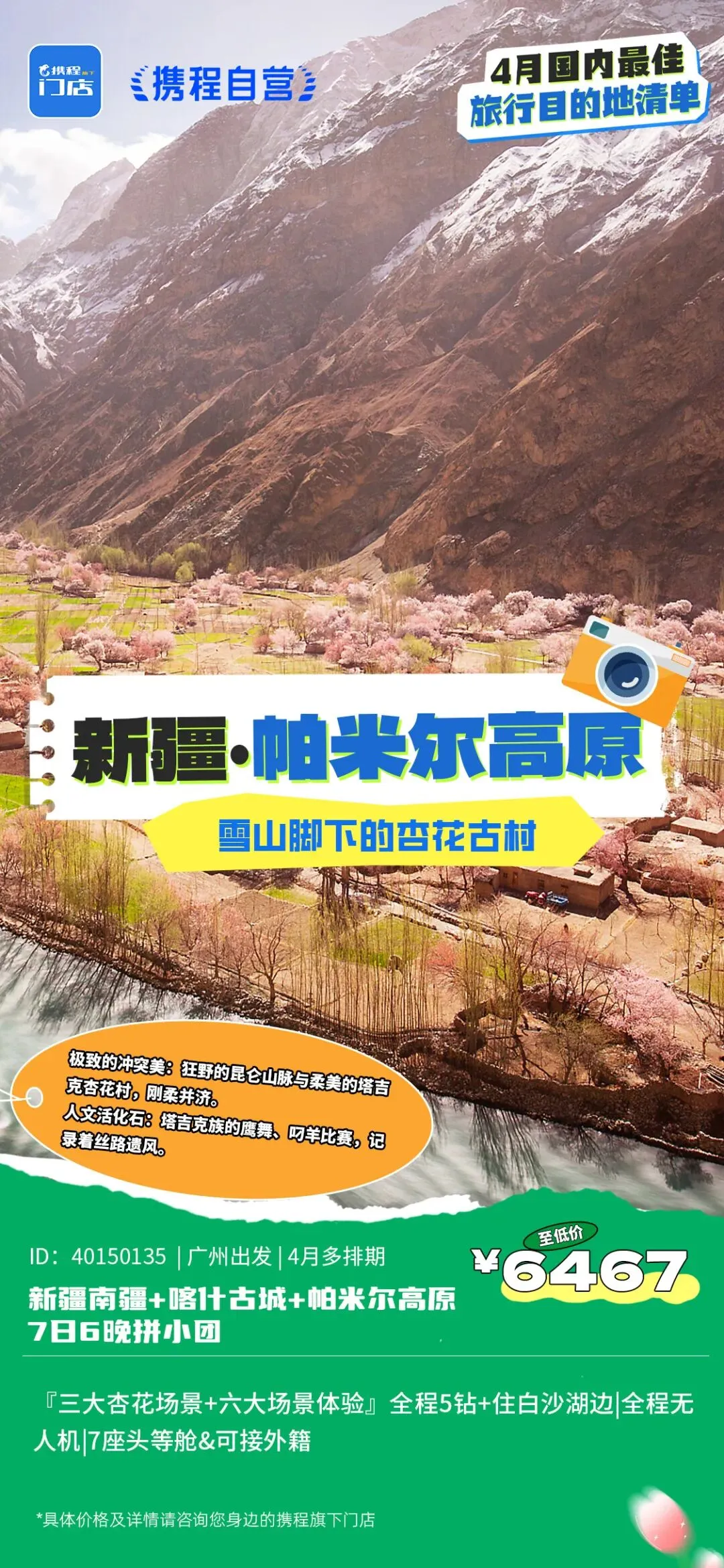 4 月的帕米尔高原,是雪山与杏花交织的秘境。慕士塔格峰银装素裹,巍峨圣洁。白沙湖、喀拉库勒湖冰雪初融,湖水湛蓝,与雪山倒影相映成画。盘龙古道百转千回,气势雄浑。更有塔尔乡、库科西鲁克乡的河谷杏花盛放,粉白花海环绕着古朴的塔吉克村落,与戈壁、雪山构成极致反差的浪漫画卷。此时游客稀少,错峰静赏,既能感受高原的雄浑壮阔,又能邂逅春日的温柔诗意,是一年中难得的好时节。