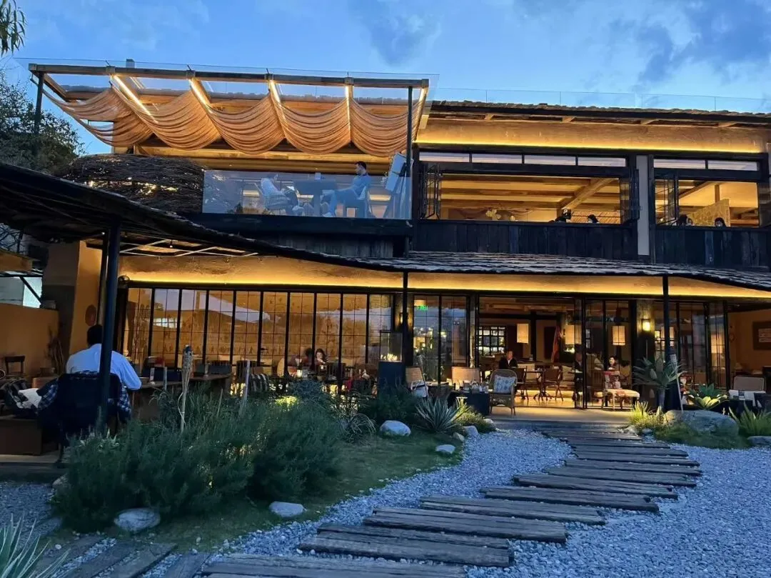 但古镇是个白天人超多,晚上变空城的地方。所以,傍晚在古镇逛逛,吃个饭其实挺舒服的。喜欢“山谷花园”的大木桌子和二楼的风景,夜间的灯光装饰也不错。