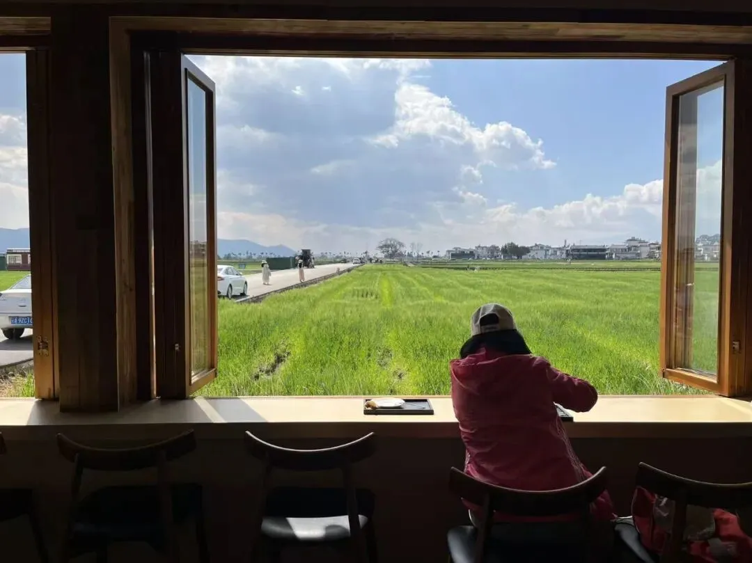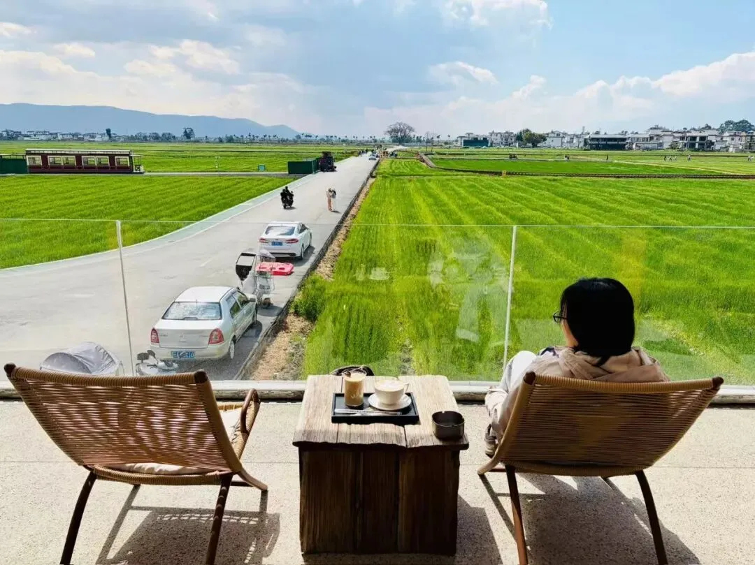 那天上午,我在麦田旁边(就是远离拍照美人的那一侧)“初见喜洲咖啡馆”泡了几个小时。从店员到客人都非常安静,也没人在自拍。有个老人优雅地坐在一层喝咖啡、吃蛋糕。还有几个中青年人在二楼露台静静地晒太阳,实在太惬意。