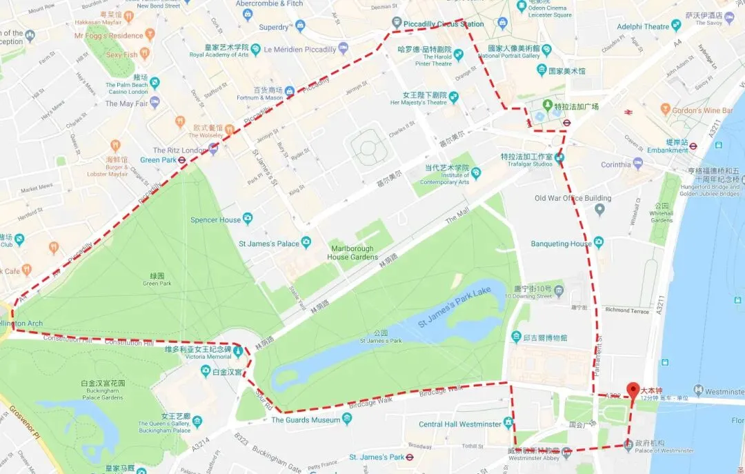 路线总结:大本钟 & 议会大厦 – 威斯敏斯特大教堂- 圣詹姆斯公园 – 白金汉宫 – 格林公园 – 皮卡迪利广场 – 中国城 – 特拉法加广场 – 皇家骑兵 – 唐宁街10号 – 伦敦眼
