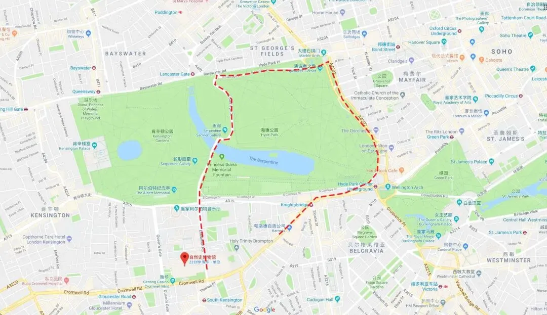 路线总结:自然历史博物馆 – 科学博物馆 – 维多利亚和阿尔伯特博物馆 – 海德公园 – 哈罗德百货商场