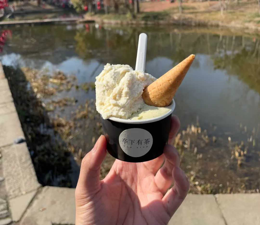 亭下有茶,茶味冰淇淋挺好吃的,可以尝尝看。他家的文创冰箱贴很精致,也可以看看。